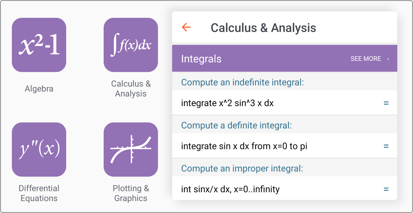 Explore Examples across Thousands of DomainsWith its simple interface, the Wolfram|Alpha app lets you instantly compute answers to questions across thousands of domains—from finance and food to math and medicine to stocks and spacecraft to wordplay and weather...